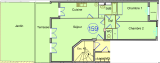 L’entrée ouvre sur le séjour qui, comme la cuisine séparée (possibilité d’ouvrir), donne sur la terrasse et le jardin. Un dégagement dessert la SdB avec placard, le WC séparé, et les deux chambres avec placards.