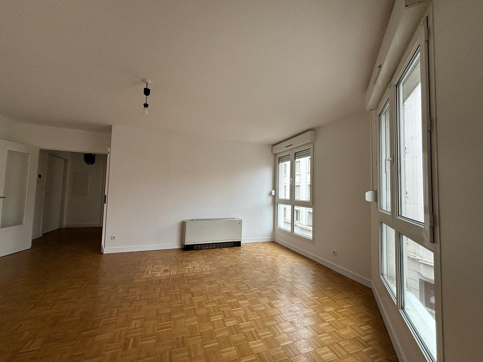 L’appartement s’ouvre sur une entrée qui va desservir le séjour et un dégagement avec placard menant à la cuisine séparée (possibilité d’ouvrir sur le salon), et à deux chambres avec placard entre lesquelles se trouvent la salle de bain et le WC séparé